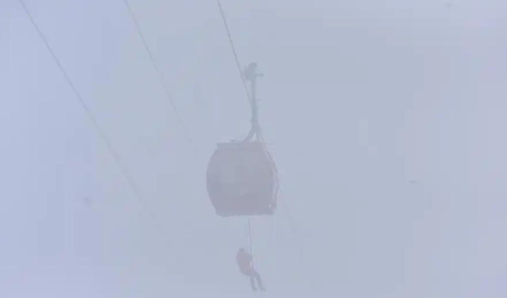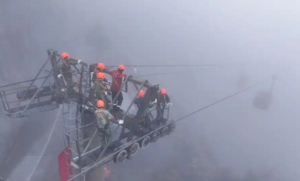 演習(xí)正式開始,運(yùn)行中的天門山索道突然停止,模擬轎廂中的乘客被困。今日山頂飄雪,演習(xí)現(xiàn)場(chǎng)大霧彌漫,能見度極低,這為救援行動(dòng)增添了額外的難度和緊迫感。雖然現(xiàn)場(chǎng)氣溫接近0°,但救援人員已經(jīng)大汗淋漓。