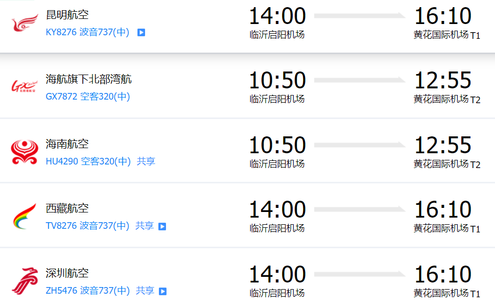 臨沂啟陽機(jī)場有直達(dá)湖南長沙黃花機(jī)場,但沒有直達(dá)張家界荷花機(jī)場航班,以下是啟陽到黃花參考: