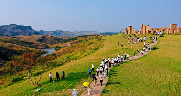 巨石陣由經(jīng)過切割的丹霞原石堆砌而成,門形石陣與水中嬌艷的荷花相互輝映,充滿了神秘而獨特的美感。在這里,建議穿著純色長裙,穿梭于石拱門之間,利用光影的變幻營造出神秘而迷人的氛圍,隨手一拍都是大片。夏季傍晚時分,這里還常有民俗表演,火把巡游的熱烈與丹霞夜景的靜謐相結合,氛圍感直接拉滿。