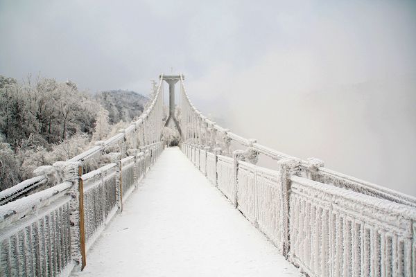 決定去天門山,一個(gè)很重要的原因就是想坐一下這個(gè)世界第一的索道——長(zhǎng)7000多米,高1000多米,從市內(nèi)直接就到了天門山頂,既刺激又輕松。一大早到了索道站,天門洞景區(qū)由于下雪封路沒法游覽,256的票價(jià)減少到225,連最著名的景點(diǎn)都去不了,看來真是來坐長(zhǎng)途索道了。
