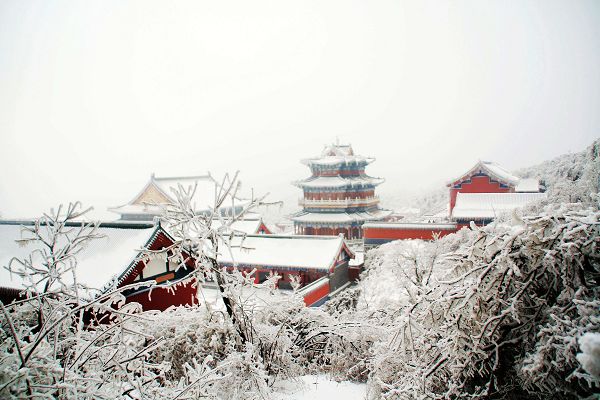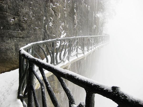 順著路一直走走拍拍,連不愛照相的俺都忍不住吆喝著來一張來一張。俺兄弟一邊拍一邊不惜余力地打擊俺:您老就別糟踐這美景了。走在鬼谷棧道,一側(cè)是山壁,一側(cè)是霧氣籠罩的懸崖,后來又下起雪來,真有點(diǎn)深山求仙的味道。其實(shí)一路走來并不累,就是總不得不從被冰掛壓倒的樹下鉆身而過,累得腰酸。再有就是俺一度說要雪盲了,眼睛都有點(diǎn)發(fā)花。最后終于到了頂端的天門山寺。確實(shí)要承認(rèn),在這樣的一番情景之下,佛性也顯得格外深沉,連那個(gè)向來不信的家伙也雙手合十。本來還想隨喜瞻仰一下佛祖真身舍利的,可被那個(gè)賣票的痞子樣給雷到而作罷。