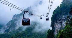 天門山索道全長7455米,水平高差1279米,沿線盡為絕壁天險(xiǎn),氣勢沖天,是世界上最為壯觀的索道之一。它以張家界市中心城市花園為起點(diǎn),經(jīng)民間田園風(fēng)光而達(dá)山頂?shù)脑伎罩谢▓@,猶如一道彩虹飛渡“人間”“天上”。