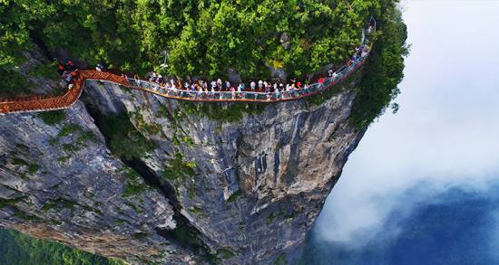 棧道全長1600米,平均海拔為1400米,起點(diǎn)是倚虹關(guān),終點(diǎn)到小天門。與其他棧道不同的是,鬼谷棧道全線既不在懸崖之巔,也不在懸崖之側(cè),而是全線都立于萬丈懸崖的中間,給人以與懸崖共起伏同屈伸的感覺。 站在棧道上俯瞰群山,古人“會當(dāng)凌絕頂,一覽眾山小”的感覺油然而生。由于天門山是國家森林公園,植被特別豐富,加上典型的喀斯特地貌,所以,在這條棧道上更能找到一種在乘坐直升飛機(jī)飛越熱帶雨林大峽谷的感覺,這平時(shí)只能在電影里看到的場景,在這里能讓你身臨其境。 由于海拔和氣流的影響,很多小鳥都不能到達(dá)與棧道平行位置。所以,站在這里,腳下是沒有邊際的綠野,成群的小鳥在峽谷中嬉戲,偶爾有老鷹從眼前掠過,閉上眼,挺著發(fā)麻的雙腿,帶著急促的心跳,伸開雙臂,你就能得到一次最完美、最刺激、最貼近自然的SPA。因?yàn)?,要知道這種在懸崖上賞風(fēng)景一般都是非人類所能享受的。 如果是雨前雨后,在棧道上則是身邊霧氣盤繞,腳下云海翻騰,令人抬腿似生霧,邁步如踏云,人間天界,世外洞天也就是如此了。 據(jù)施工人員介紹,此條棧道也是他們所修棧道中施工最難,最險(xiǎn)峻的一條。如果您還覺得不夠刺激的話,在棧道的完結(jié)處的兩個懸崖之間有一條長160米的懸索吊橋,同時(shí),在海拔最高點(diǎn)還有一個挑戰(zhàn)心里極限的玻璃站臺,在這里,如果你能挺直腰板伸開雙臂,那么,您就是真正的勇士了。