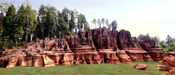據(jù)地質(zhì)專家考證:紅色石林巖石形成的歷史約4。5億年,地質(zhì)史上稱之為揚子古海(海底沉積了大量混合泥沙的碳酸鹽物質(zhì),經(jīng)地殼運動和侵蝕、溶蝕作用形成了這片美麗的地質(zhì)奇觀)。景區(qū)內(nèi)遍布高大奇石,造型各異、顏色變化多端,且隨天氣、時間、季節(jié)變化而變化,晴紅雨黑、陰轉(zhuǎn)褐紅、晨昏有別。 景區(qū)內(nèi)石景有:蜀犬吠日、乳燕待哺、樓蘭古城、蝸牛搬家、七彩迷宮、利劍刺空、航母巡游、石兵列陣、少女出浴、觀音坐蓮、石鞭候主、靈龜探海、粽熊迎客、天狗吠日、水獺望云、母雞搗窩、駝鈴聲聲····尤以“巨人圓”、“古城故宮”、“八卦奇陣”、“諸葛藏書”為奇石絕景中的最佳。 景區(qū)內(nèi)還有地下溶洞、絕壁天坑、神秘地坑、千年古木、土家山寨、土風民俗、集商遺址····