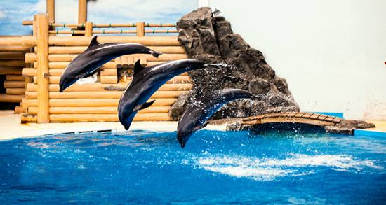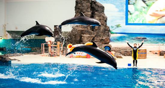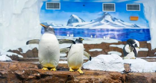 極地館:主要為極地動物區(qū),分為白鯨池、海獅池、海豚池、海豹池、企鵝池、水獺池等水生生物展示休息表演池,以及北極狼舍、北極狐舍等陸生生物展示休息籠舍。館內建有一個高大寬敞明亮,音響等設備設施先進配備LED大型顯示屏的表演劇場,可供1800多游客同時近距離觀賞海豚、海獅等精彩表演。